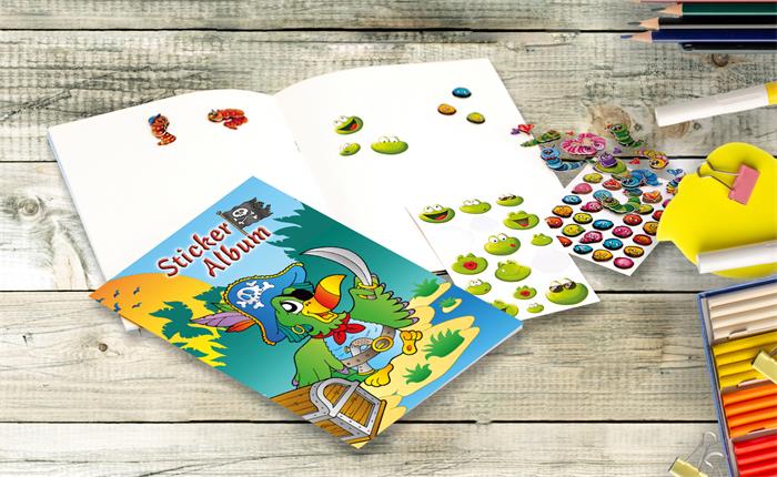 Az Avery papagáj mintás matricagyűjtő album vidám és praktikus megoldás a matricák rendszerezésére és újrahasználható tárolására.